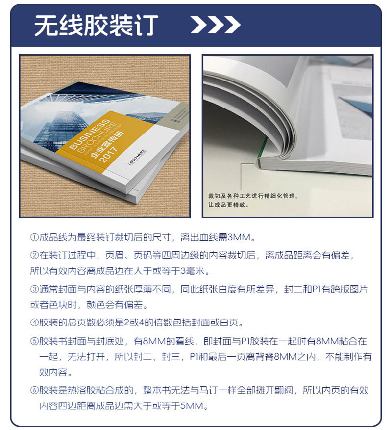 無線膠裝:將書脊處打毛,用熱熔膠將書貼粘在一起。