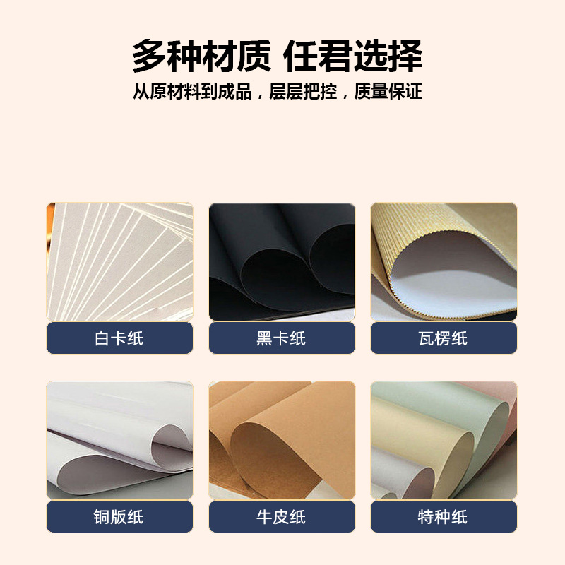 印刷紙張:銅版紙、雙膠紙、啞粉紙、珠光紙、其他藝術(shù)紙(藝術(shù)紙種類較多我們可以免費(fèi)提供紙樣供您選擇)
